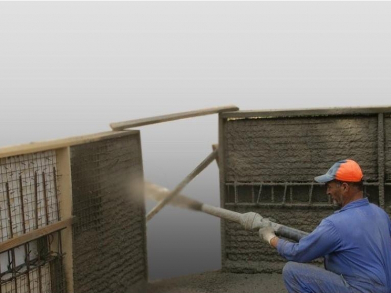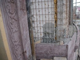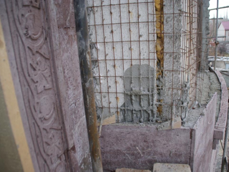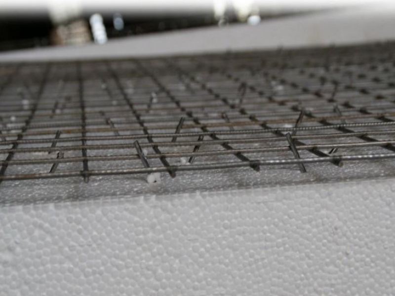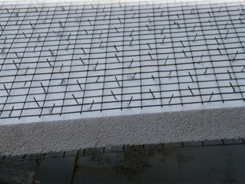 Армированные пенопластовые плиты вставляются на бетонную основу и просто с помощью провода связываются к заранее оставленным торчать из бетона трубам. Бетонирование стен осуществляется путем торкретирования. В результате получается готовая к окончательному декорированию поверхность. Причем внешняя поверхность стены можно бетонировать и более тонким слоем, не закрывая арматурную сетку, и использовать последнюю для внешней облицовки.
